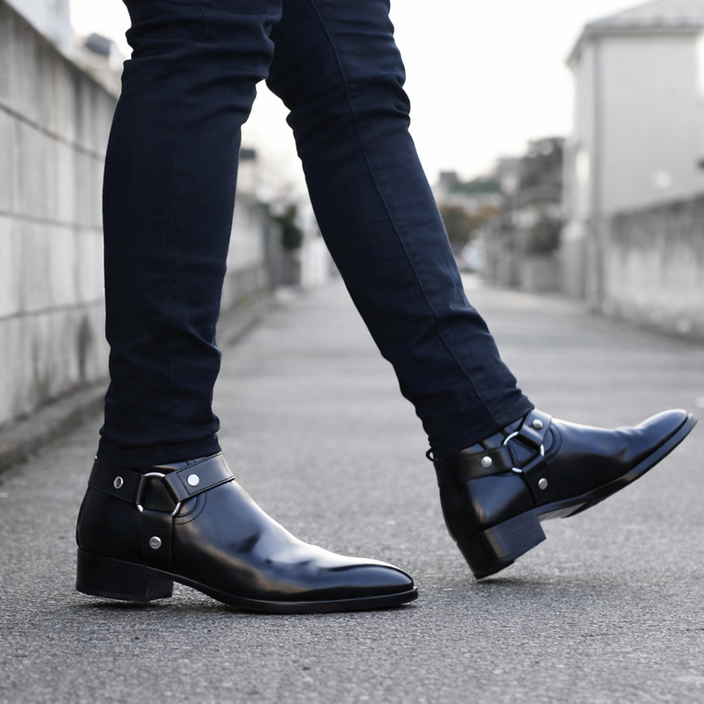 Crafted from high-quality genuine leather, these ankle boots feature a smooth, polished surface that reflects premium craftsmanship. The iconic harness strap with metal accents adds a rugged yet refined character, while the pointed toe and balanced heel ensure a sharp, masculine silhouette. Ideal for everyday wear, evening outings, and statement fashion.