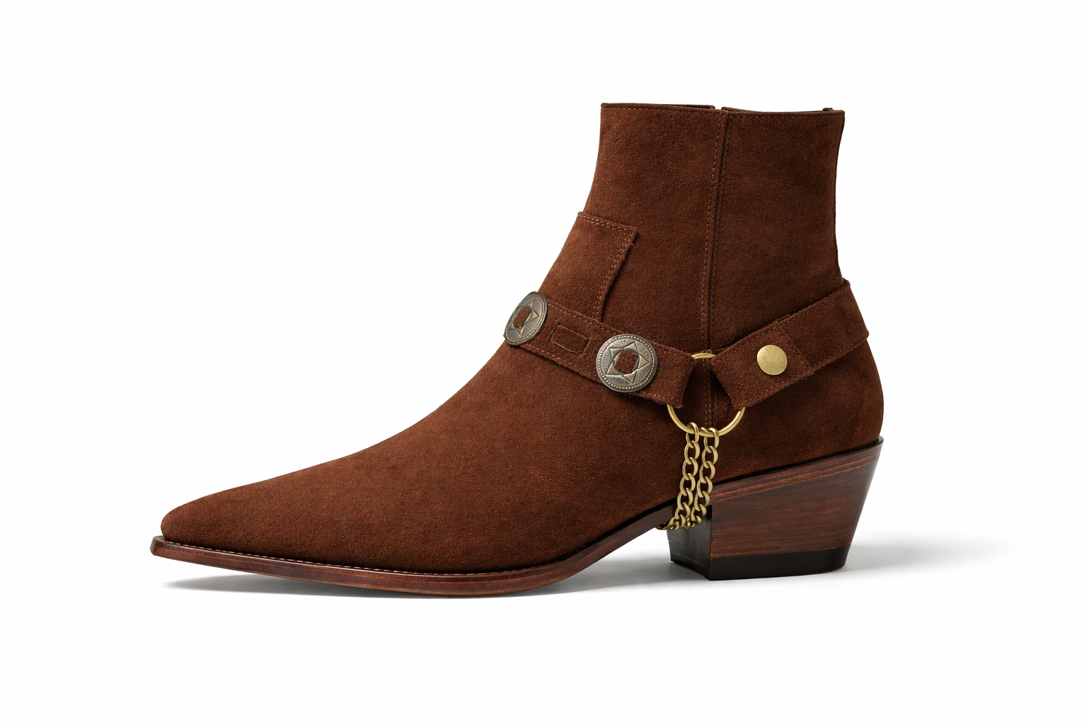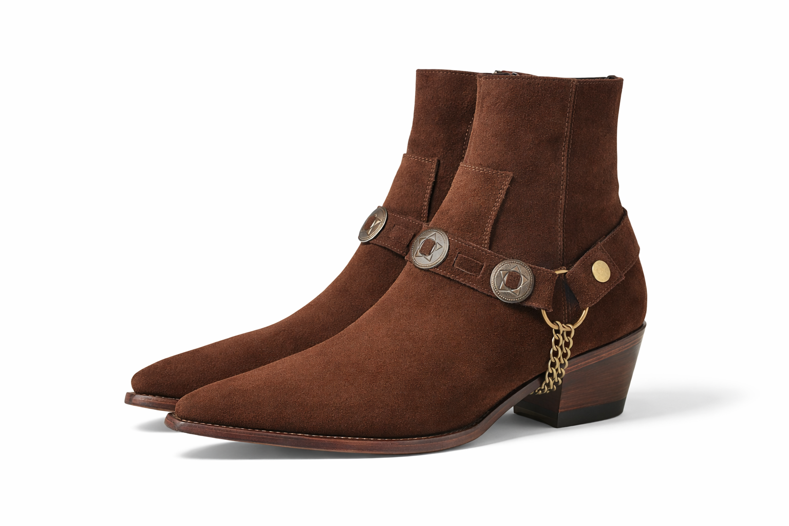 Crafted from high-quality suede leather, these ankle boots offer a soft, velvety texture with a deep, luxurious tone. The signature harness strap with metallic studs and chain detailing adds a unique character, while the sleek pointed toe and balanced heel enhance the overall silhouette. Ideal for smart-casual wear, evening looks, and premium fashion styling.