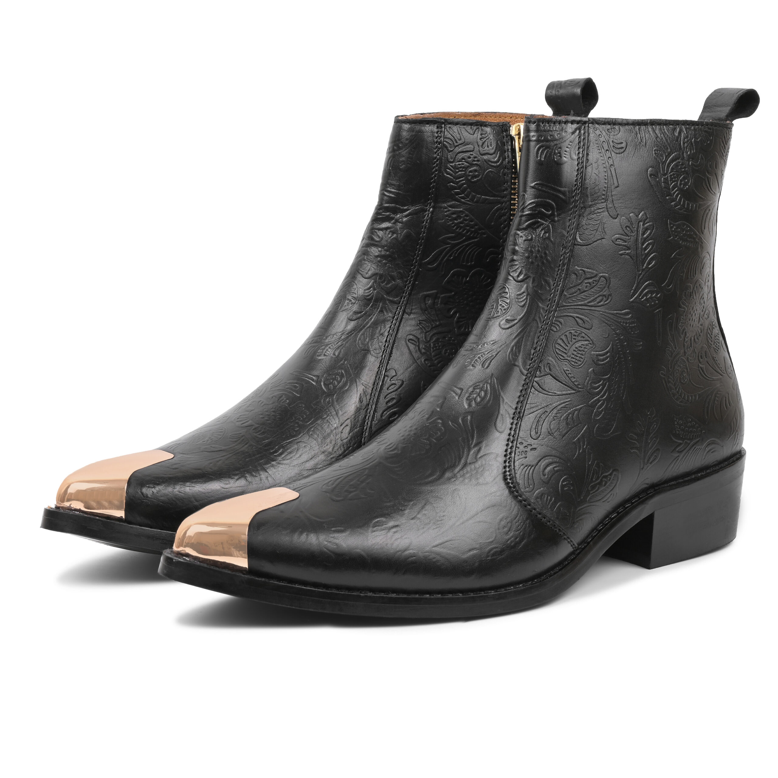 A bold black embossed-leather Chelsea boot engineered to stand out. The handcrafted floral texture delivers artistic luxury, while the polished metal toe-cap adds a sharp, Western-inspired attitude. Built on a low block heel with a clean side-zip silhouette, this boot blends premium craftsmanship with fearless style — made for men who lead, not follow.”